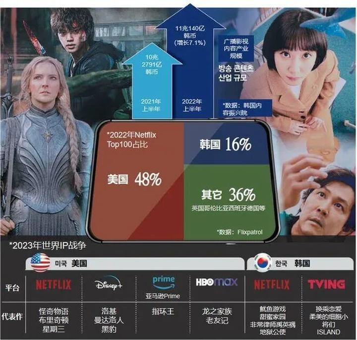 韩剧赖以生存的分发平台,从公营免费电视、收费有线电视,已经全面转换到了OTT(over-the-topmedia网络视频播放平台)这一新赛道上,2023年是OTT竞争全球化的重要节点,全球OTT都完成了对传统电视台和付费有线电视的全面超越。据韩国KBS公营传媒研究所推算,韩国人口规模5000万左右,韩国国内OTT市场规模为19亿美元左右,全球OTT市场规模为880亿美元。利用美国的体系优势和韩国的廉价产能,让韩国媒体行业为美国“来料加工”,似乎是能有效抢占全球市场的双赢举措。