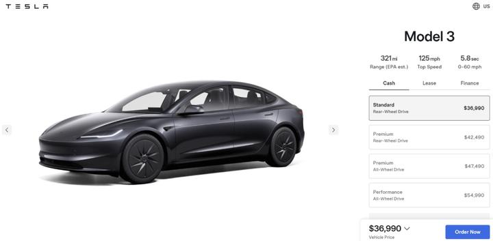 特斯拉官网显示,美国标准后轮驱动版Model Y售价为39,990美元,续航里程为321英里(美国环保署估计值),标准版Model Y内饰配备手动调节转向轮,而非电动调节转向轮。特斯拉美国标准后轮驱动版Model 3在美国的售价为36,990美元。