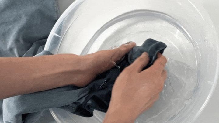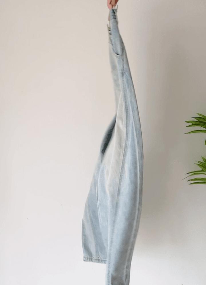 看,使劲揉搓后,把裤子展开,抖一抖、拍一拍,依旧平整,久穿不易鼓包,久洗不易变形,打理起来很方便,可以直接机洗。