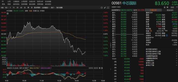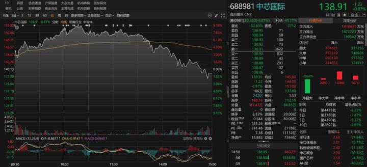 10月9日午后,中芯国际股价大幅走弱,中芯国际A股从上午最高上涨超9%,到以下跌0.87%报收。