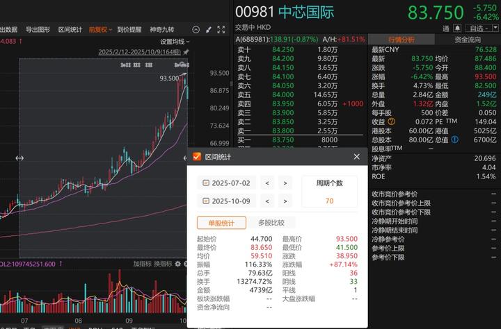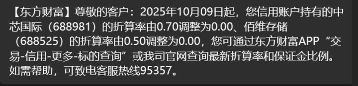 从消息面看,有投资者收到东方财富证券通知:2025年10月09日起,您信用账户持有的中芯国际(688981)的折算率由0.70调整为0.00、佰维存储(688525)的折算率由0.50调整为0.00。