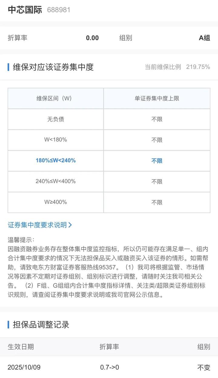 在东方财富证券App上,中芯国际折算率已经调整为0,生效日期为10月9日。