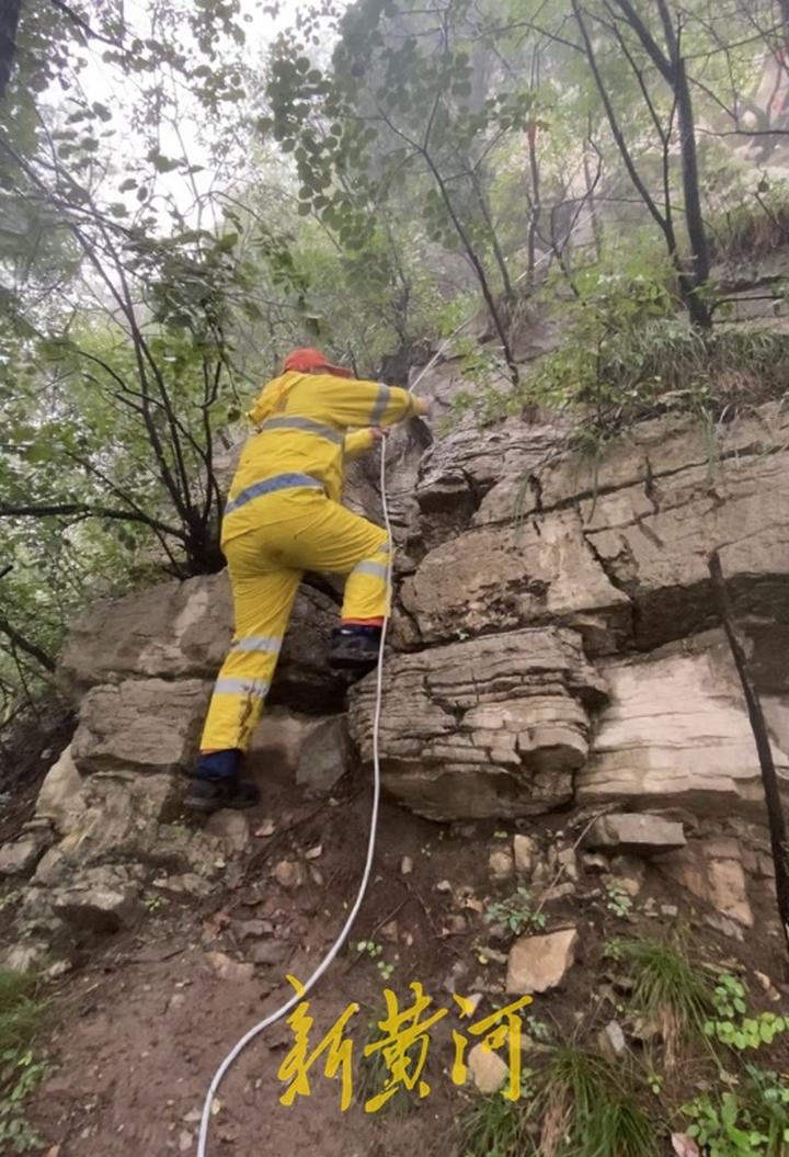 现场救援人员在接受新黄河记者采访时表示,由于连续降雨,雾气很大能见度极低,上山道路湿滑泥泞,对于悬崖,救援人员在雨中进行了索降,“今天准备了50米的绳索在悬崖旁边准备索降,索降地坡度很大,下降过程需要非常地小心。”