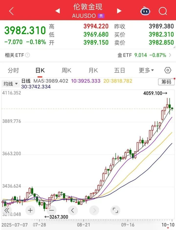 截至今日10时16分,现货黄金价格报3982.31美元/盎司。