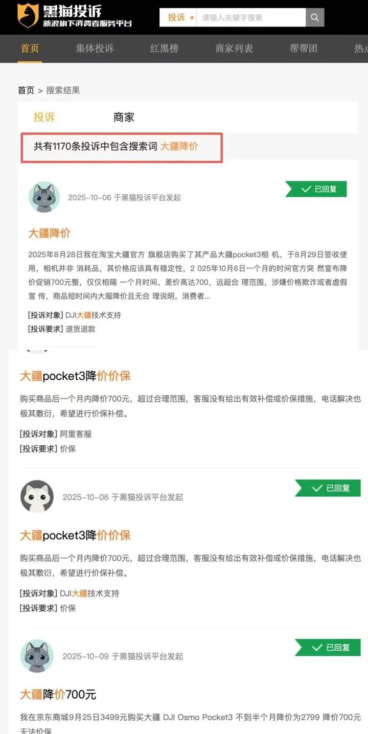 在黑猫投诉平台上搜索关键词“大疆降价”,目前已有1170条相关投诉