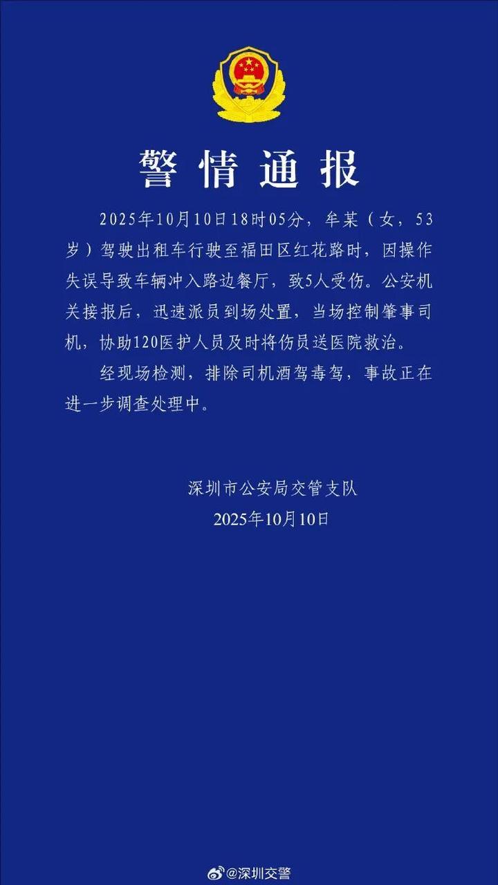 2025年10月10日18时05分,牟某(女,53岁)驾驶出租车行驶至福田区红花路时,因操作失误导致车辆冲入路边餐厅,致5人受伤。公安机关接报后,迅速派员到场处置,当场控制肇事司机,协助120医护人员及时将伤员送医院救治。