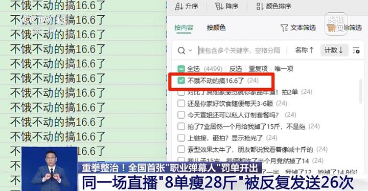 通过市场监管人员导出的一场直播的所有虚假弹幕,记者注意到,其中有大量重复发送的虚假弹幕内容:在同一场直播中“8单瘦28斤”被反复发送了26次,“不饿不动瘦16.6”被发送24次。