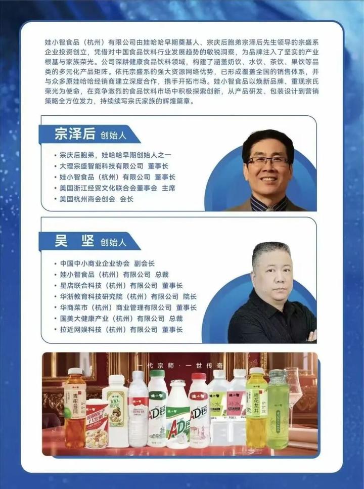 相关招商信息指出,娃小智食品(杭州)有限公司由娃哈哈早期奠基人、宗庆后胞弟宗泽后领导的宗盛系企业投资创立,公司构建了涵盖奶饮、水饮、茶饮、果饮等品类的多元化产品矩阵。宗泽后担任董事长,吴坚担任总裁。依托宗盛系的资源网络优势,娃小智已形成覆盖全国的销售体系,并与众多原娃哈哈经销商建立深度合作,携手开拓市场。娃小智食品以焕新品牌、重现宗氏荣光为使命,在竞争激烈的食品饮料市场中积极探索创新。