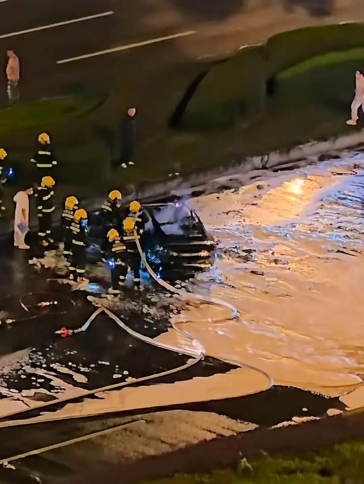 消防人员到场后,先用水枪压制火势,随后用工具切割车身救援,现场方才逐步得到控制,但驾驶员已不幸遇难。