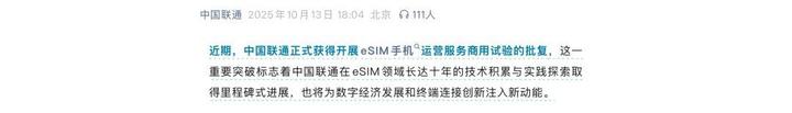 中国联通13日还披露关键数据——截至10月13日,全国手机eSIM业务预约通道用户已突破5万,“联通eSIM选择更随心”服务页面持续高热度,直观反映用户对无卡通信的迫切需求。