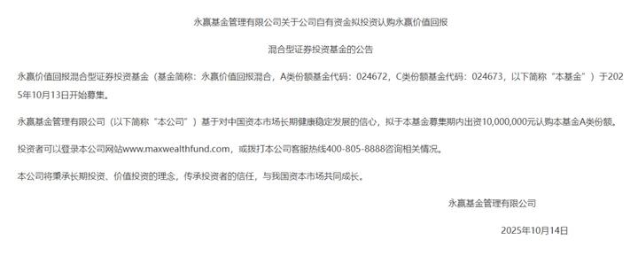 出于对后市的看好,近期基金公司也积极自购旗下权益类基金。10月14日,永赢基金公告称,基于对中国资本市场长期健康稳定发展的信心,拟于永赢价值回报混合基金募集期内出资1000万元认购该基金A类份额。此前,国泰基金也宣布,基于对中国资本市场高质量发展的信心,国泰基金及拟任基金经理将共同出资不低于1200万元认购国泰启明回报混合基金。