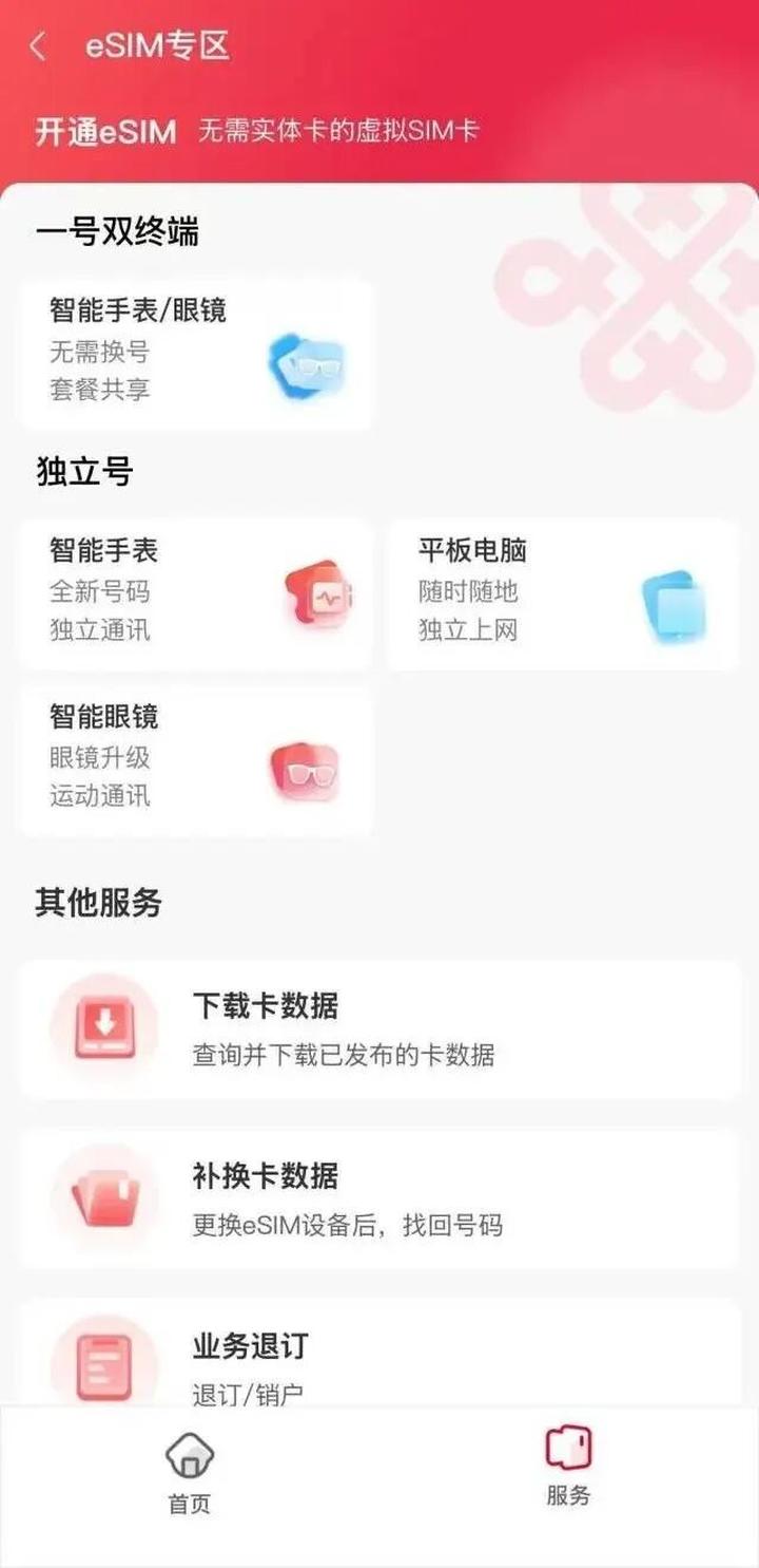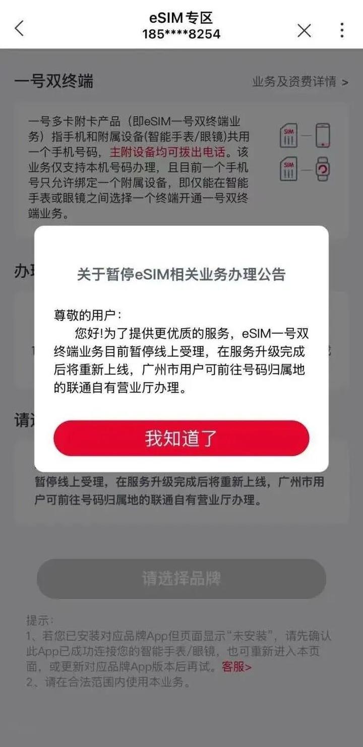 中国联通方面,登录App后,输入“eSIM”进行查询,联通设置了eSIM专区,但是点进去专区,其中的服务是针对智能手表/眼镜,还没有凸显手机业务,在继续点击“一号双终端”后,界面突然弹出关于暂停eSIM相关业务办理公告的提示,但是其实细看,却发现只是声明线上业务办理暂停,用户需到线下营业厅办理,用户如果不仔细看,很容易因为标题以为eSIM办理暂停了。