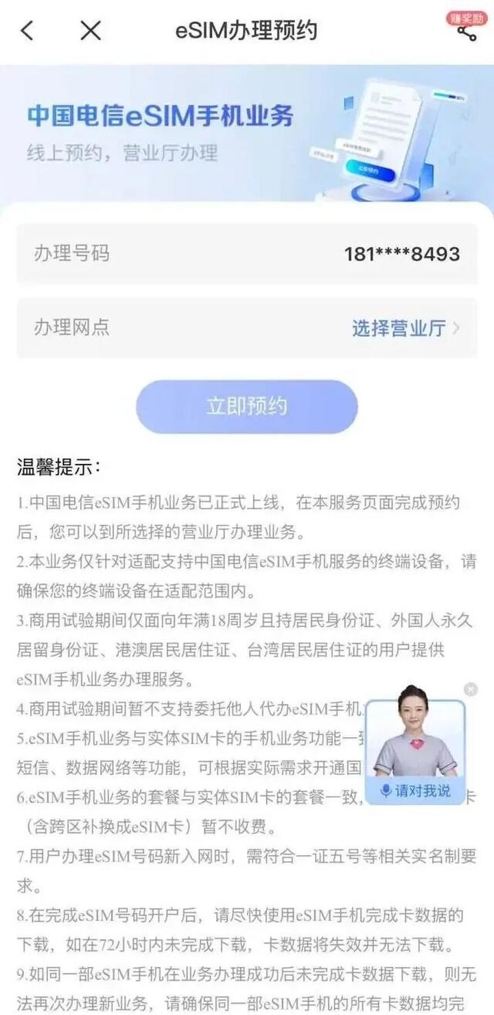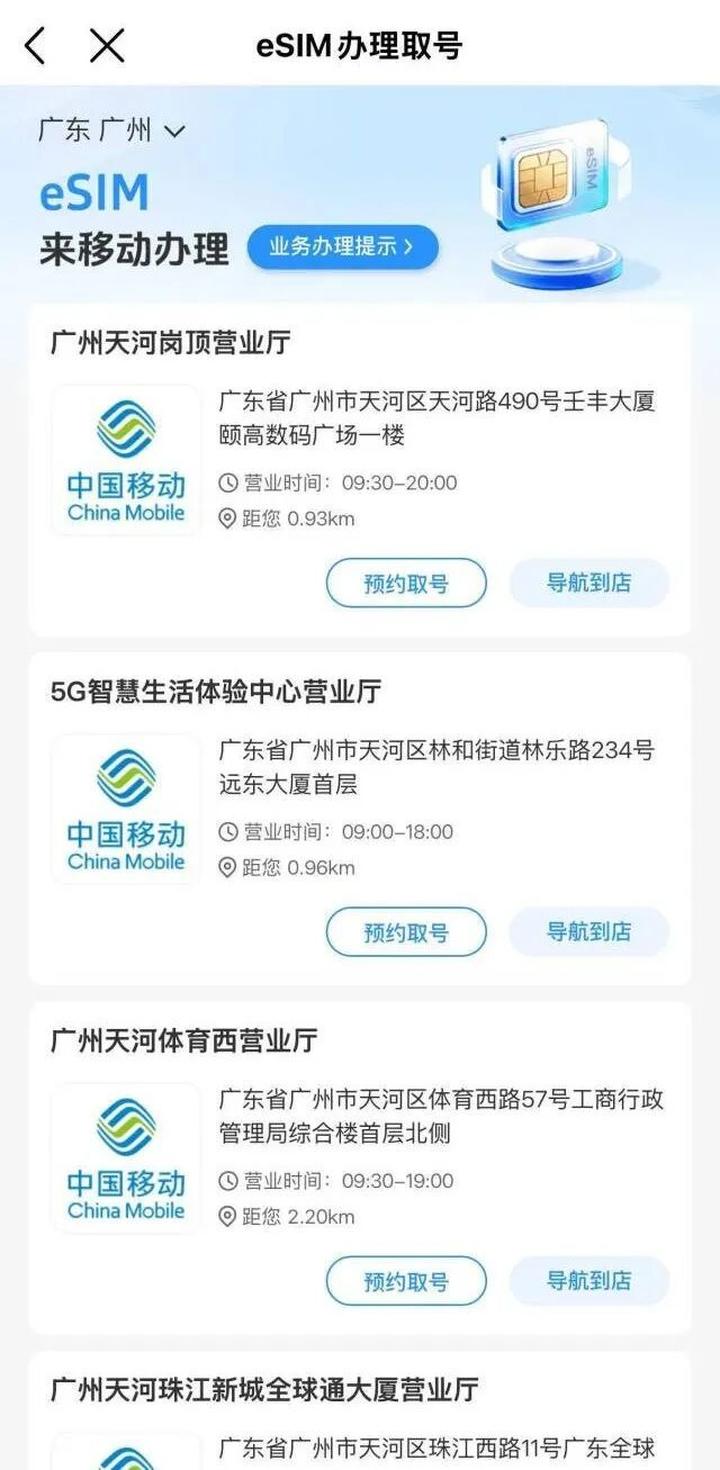 中国电信和中国移动方面,登录App后,输入“eSIM”进行查询,发现这两家都采用了同样的方法,直接跳转指示用户选择附近营业厅进行预约。