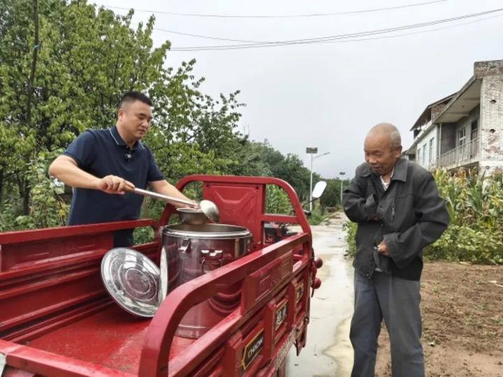 庞富强给村上老人盛饭。图源:强强村支书视频号
