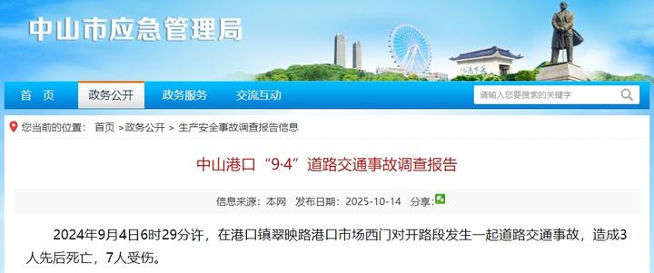 广东中山市应急管理局10月14日发布《中山港口“9·4”道路交通事故调查报告》(以下简称《报告》)。报告显示,该事故是一起因车辆驾驶人操作不当,致使车辆失控与路上人员发生碰撞造成的生产安全责任事故。