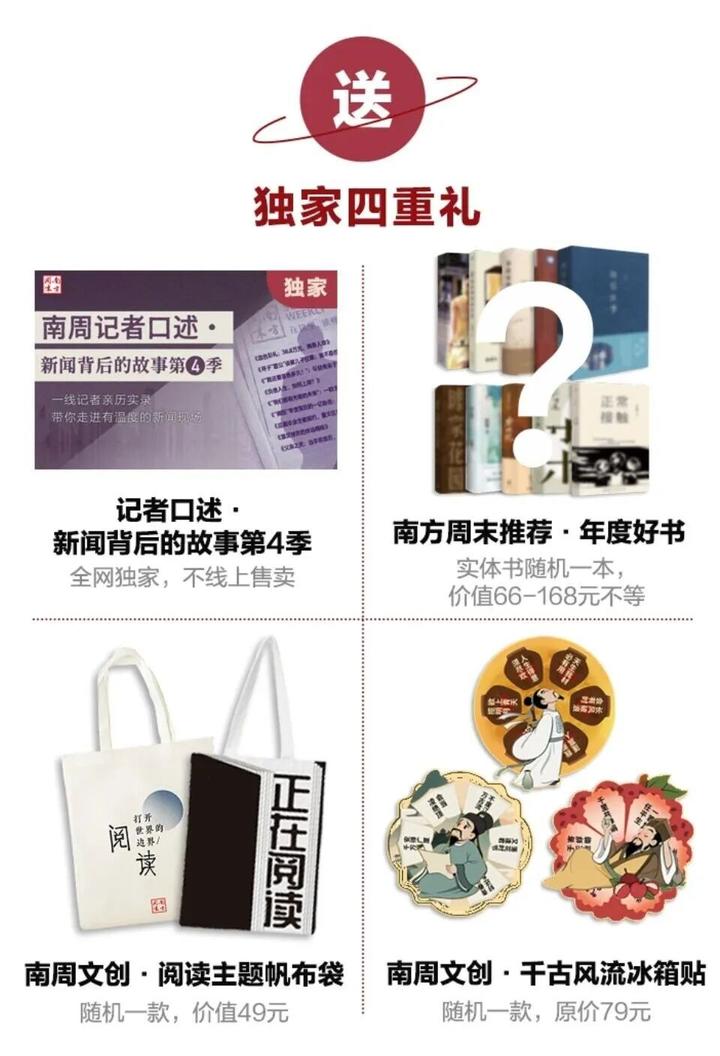 别着急~今年,我们依然给大家准备了四重厚礼!(小声说:为了能让大家拿到好看又有惊喜,还能代表南周特色的礼物,产品是筛了一轮又一轮)