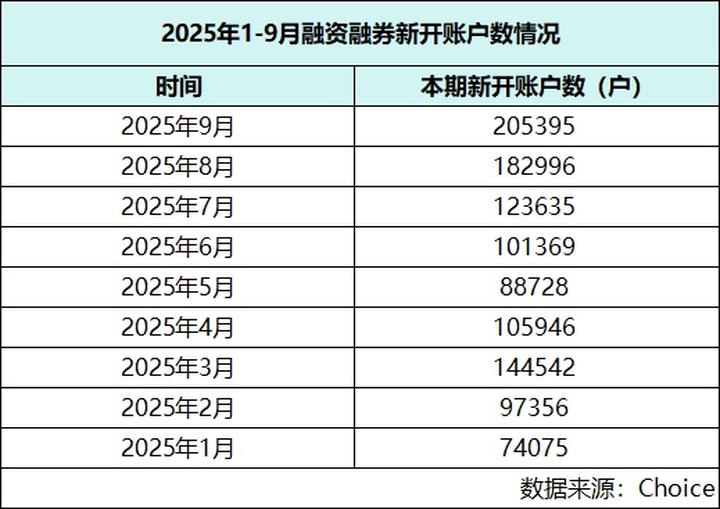 最新数据显示,2025年9月,A股市场融资融券新开账户数量突破20万户,创下年内月度新高。与此同时,两融余额同步攀升至历史高位。多项指标显示,当前杠杆资金风险整体可控,市场结构趋于稳健。