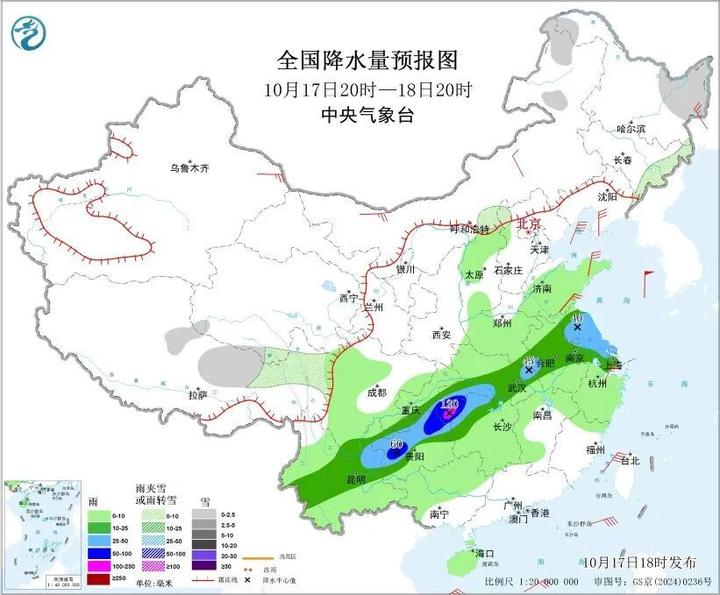 10月17日20时至18日20时,贵州中北部、重庆东南部、湖南西北部、湖北西南部和东北部、江苏中南部、云南东北部等地部分地区有大到暴雨,其中,湖南西北部、重庆东南部等地局地有大暴雨。