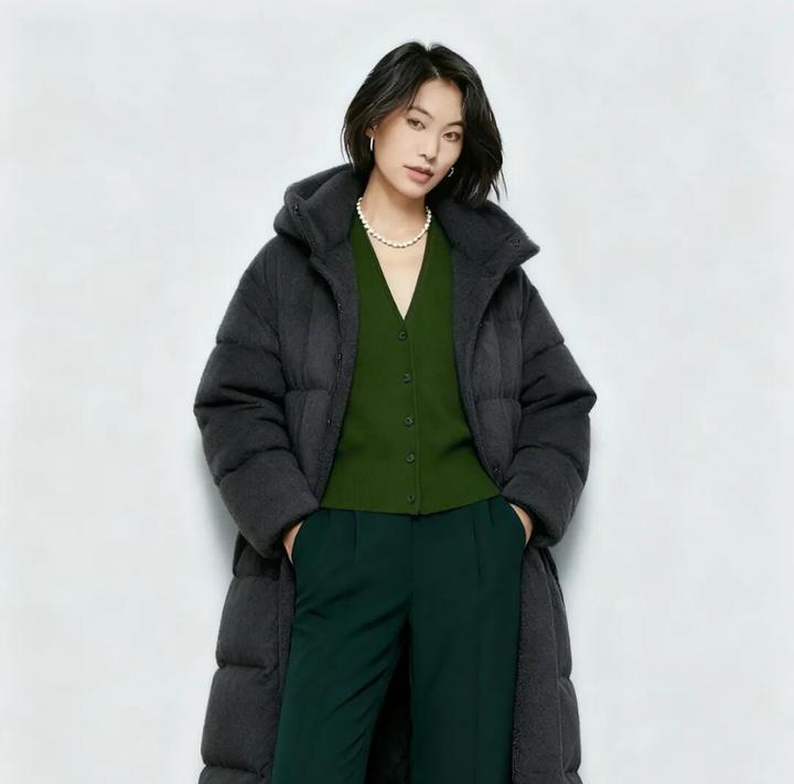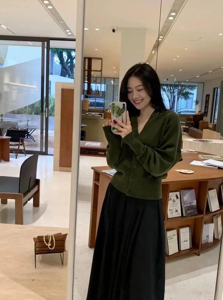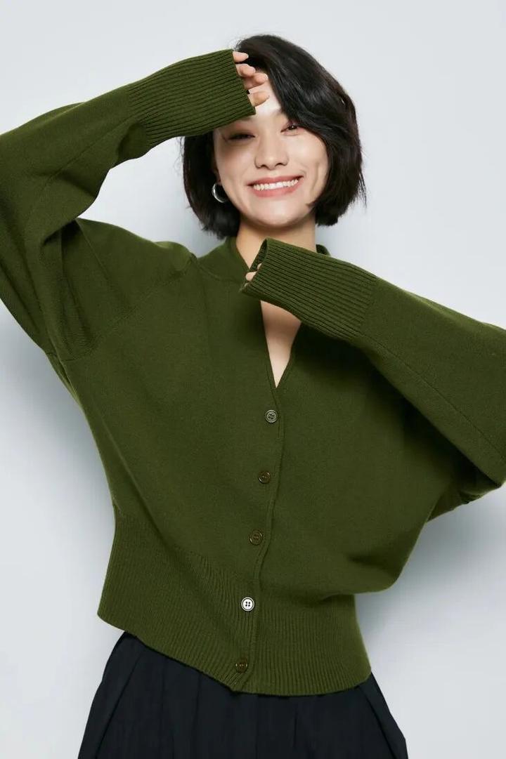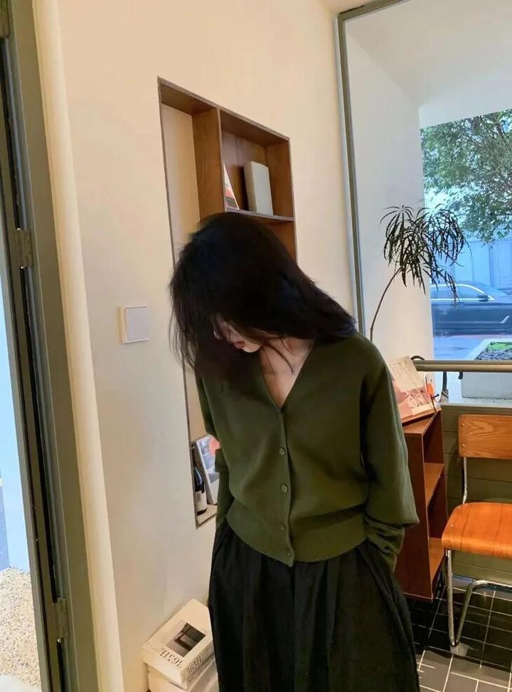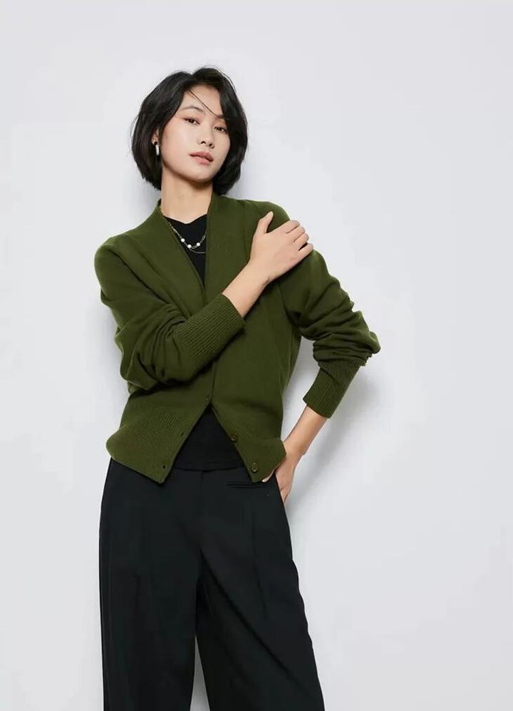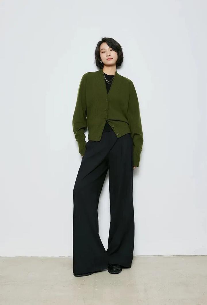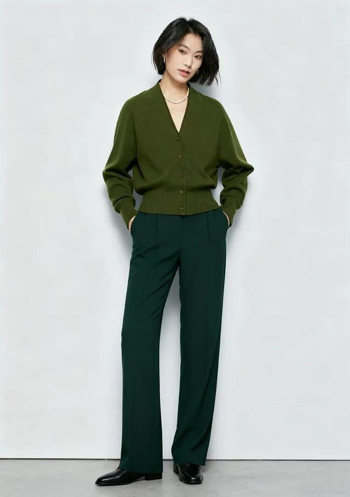 搭配公式:暗冷杉绿开衫 + 米白亚麻阔腿裤 + 乐福鞋。
