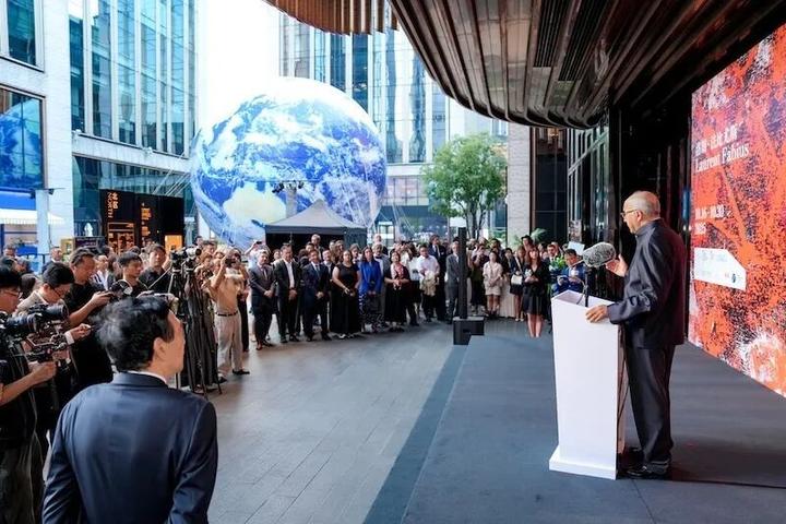 上海“在乐园”开幕式现场,洛朗·法比尤斯在致辞