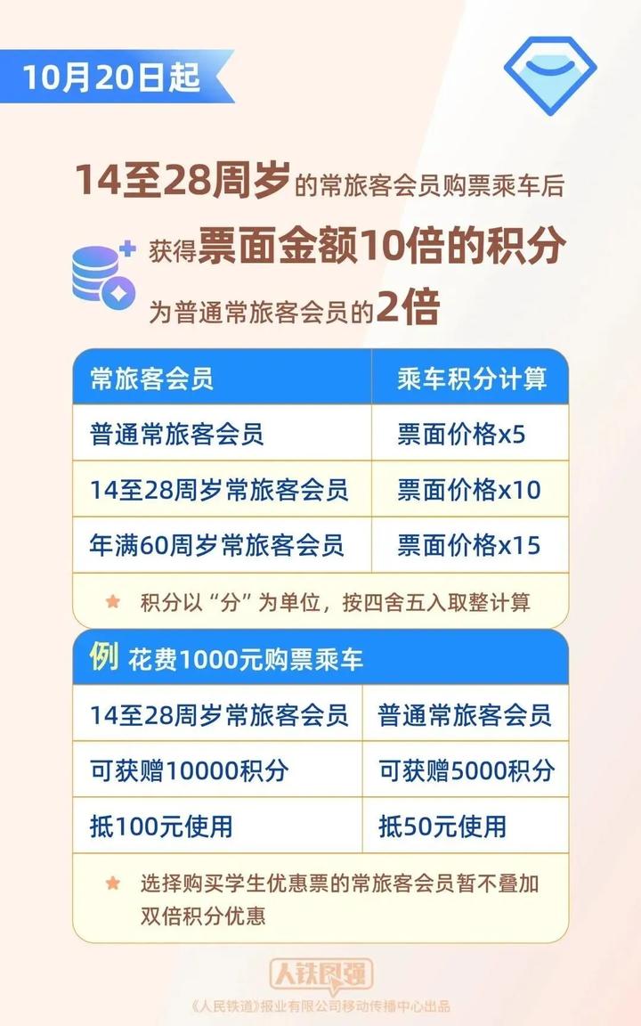 今天(20日)起,14至28周岁的常旅客会员购票乘车后将获得票面金额10倍的积分,为普通常旅客会员的两倍,即: