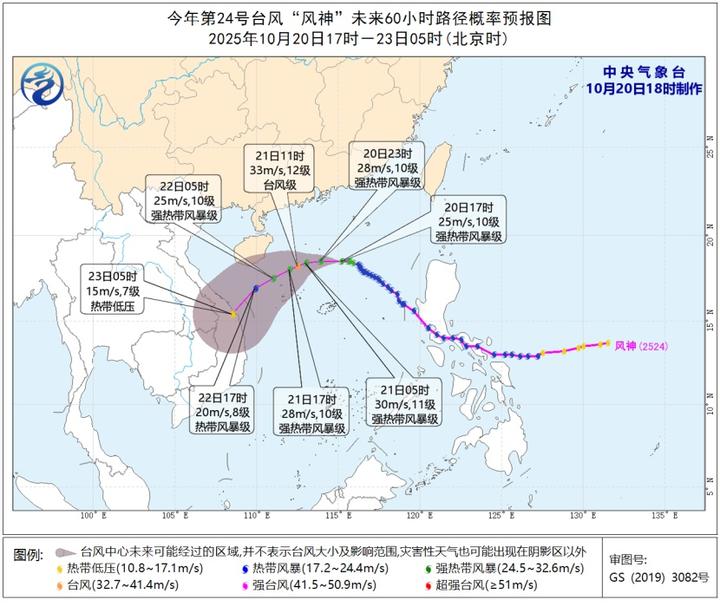 中央气象台今天(20日)18时发布台风黄色预警:今年第24号台风“风神”已于今天下午由热带风暴级加强为强热带风暴级。预计,“风神”将以每小时20公里左右的速度向偏西方向移动,强度继续增强,最强可达强热带风暴级或台风级;21日白天受南下冷空气影响,将在南海西部海面转向西南方向移动,趋向越南中部沿海,强度逐渐减弱。