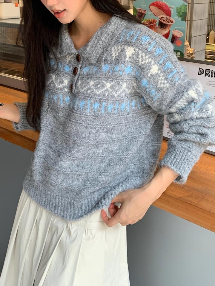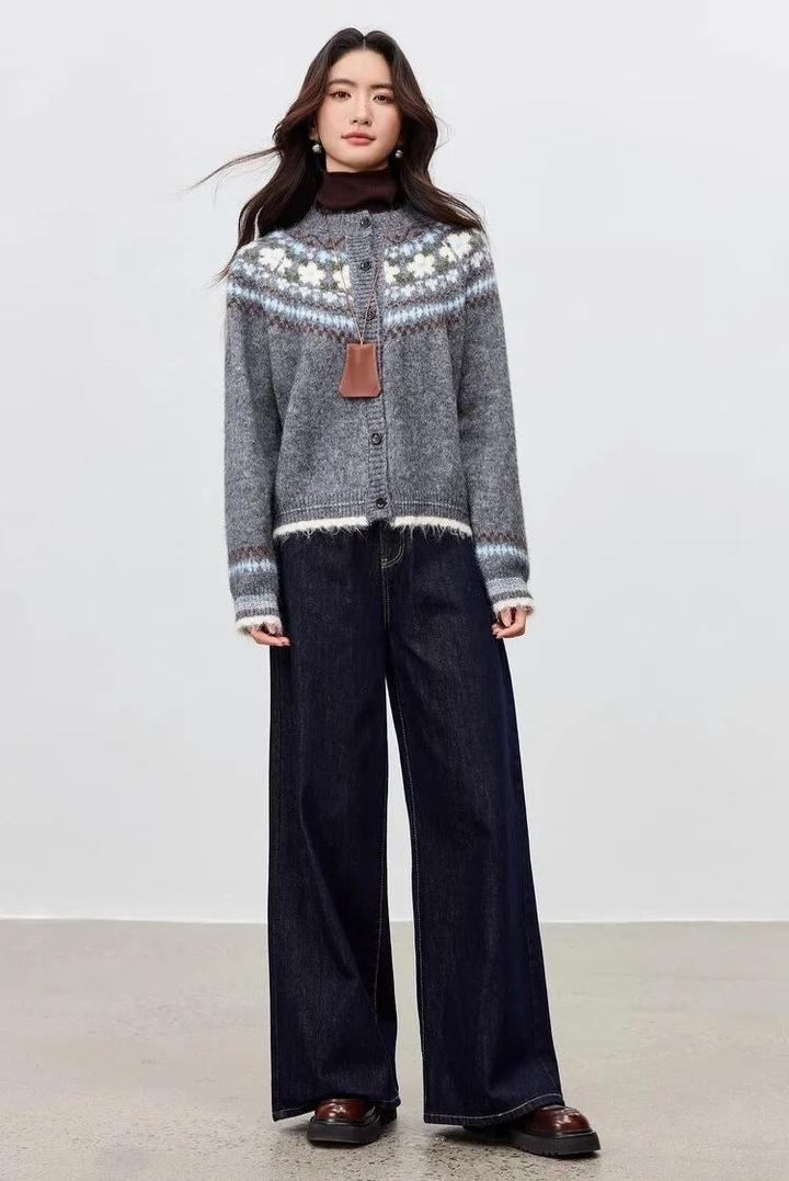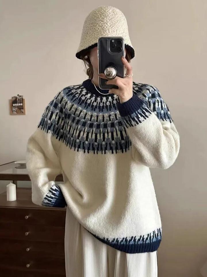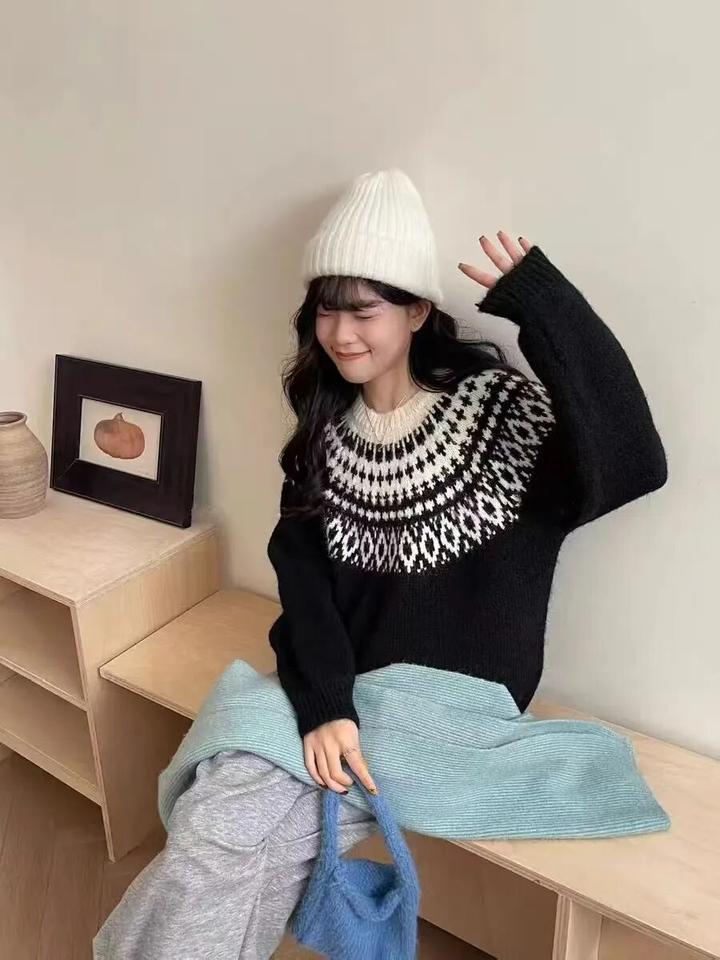 几何图形和自然元素的交织,为毛衣增添了丰富的视觉层次和艺术感。