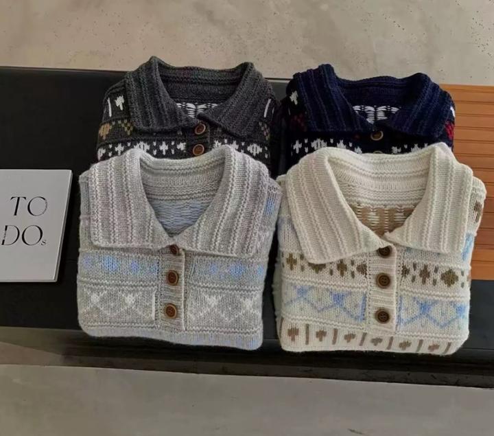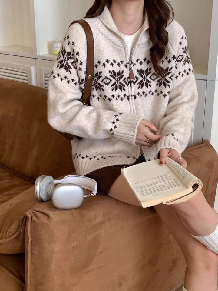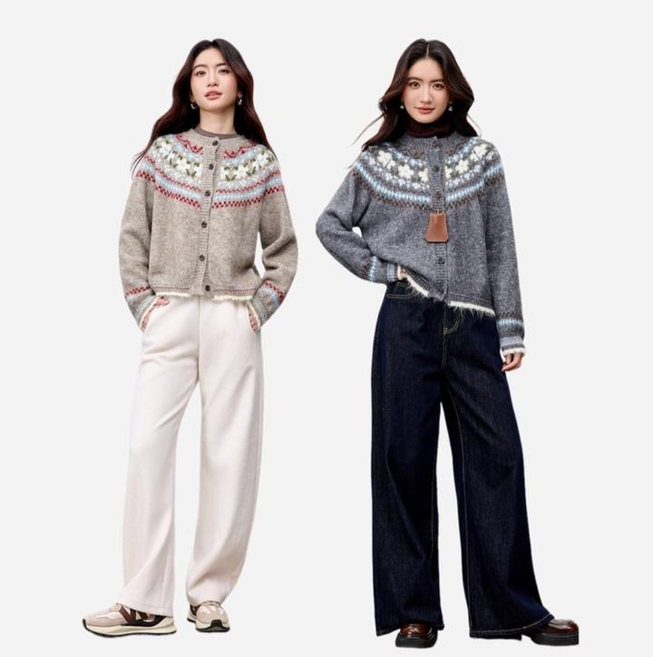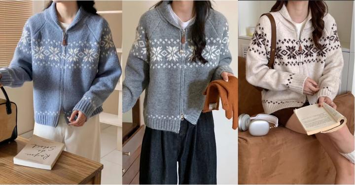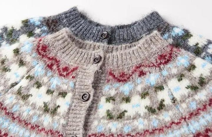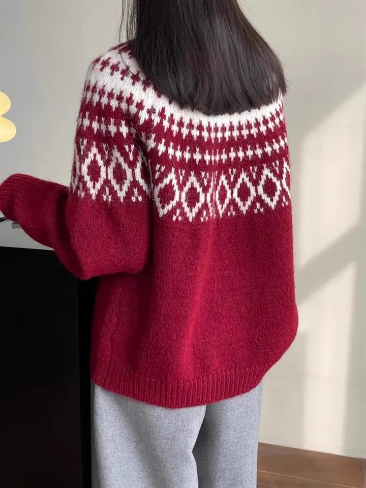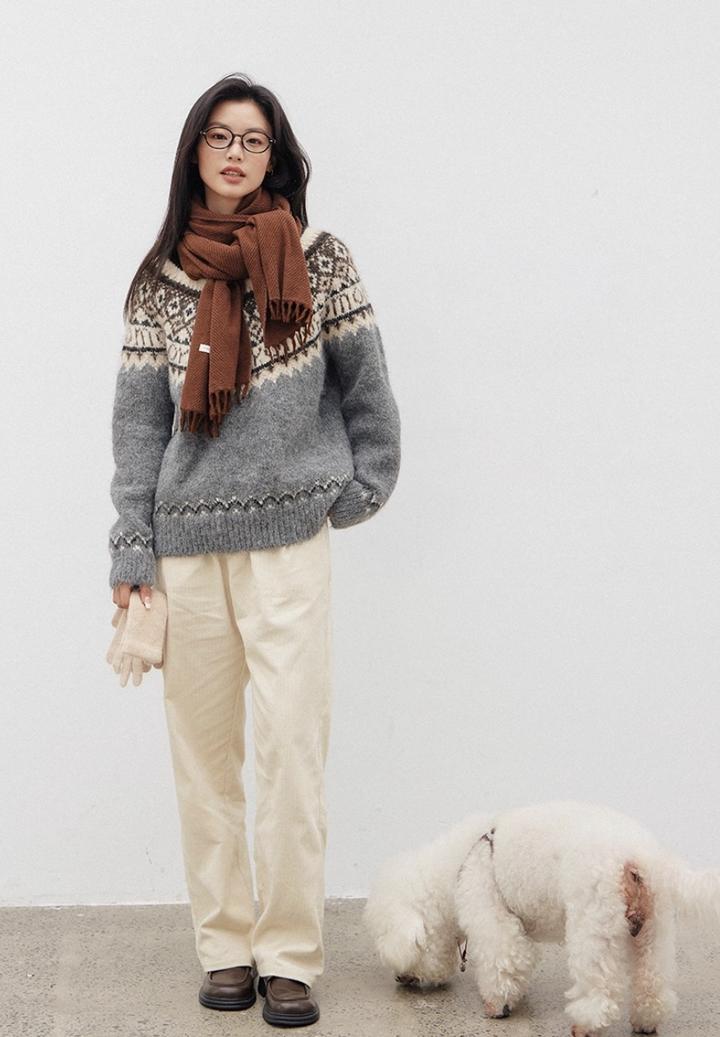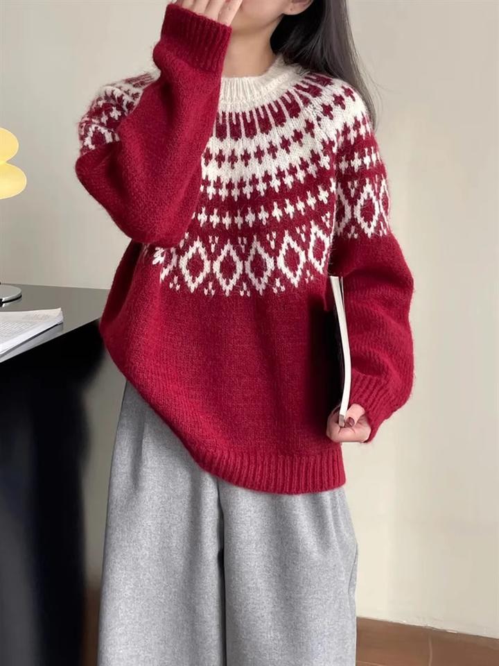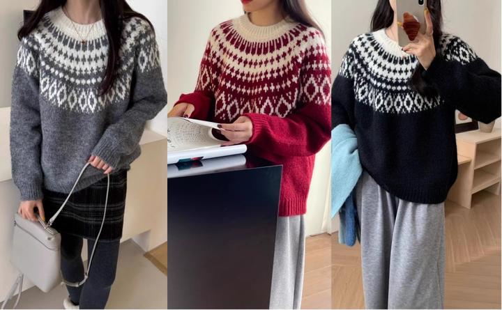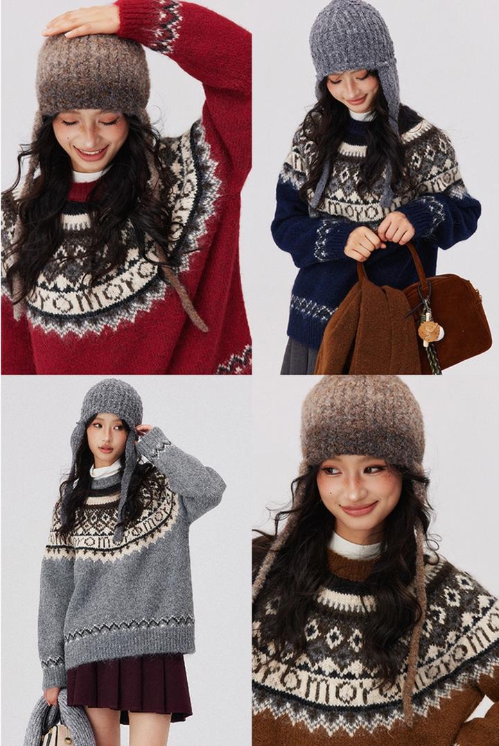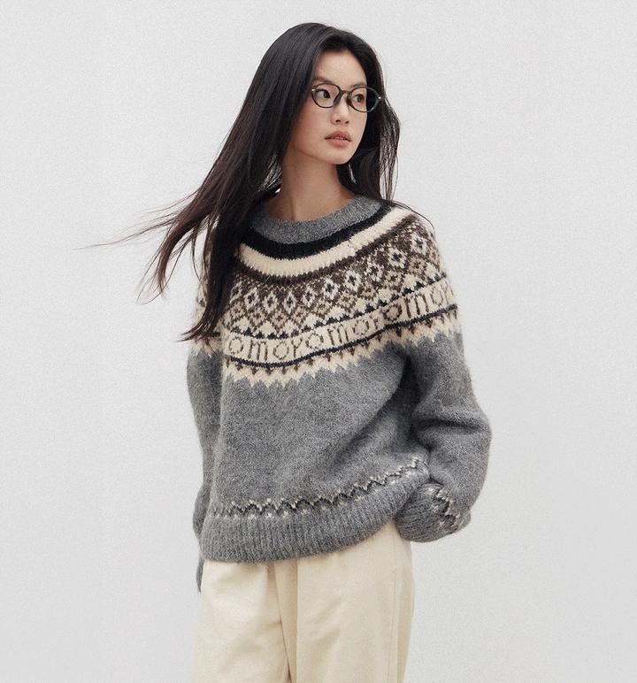 毛衣以柔和的米白色、棕色、红色为基调,融合精美的费尔岛风格图案,营造出一种温暖而复古的氛围。