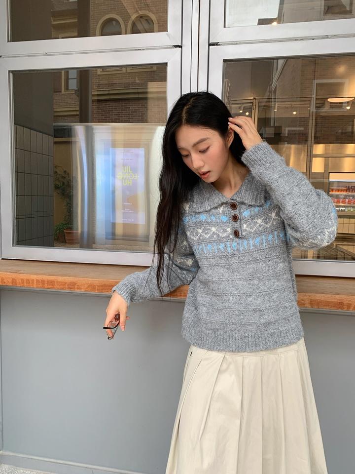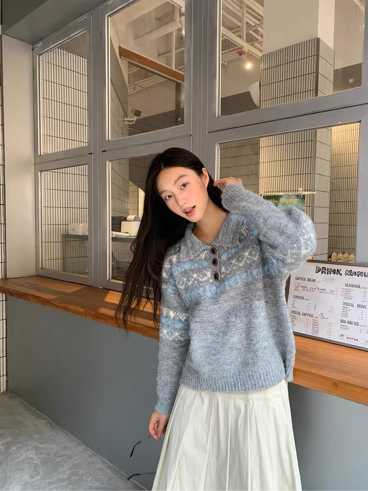 毛衣采用了小翻领设计,不仅增添了一份优雅与精致,也为颈部提供了温暖的保护。