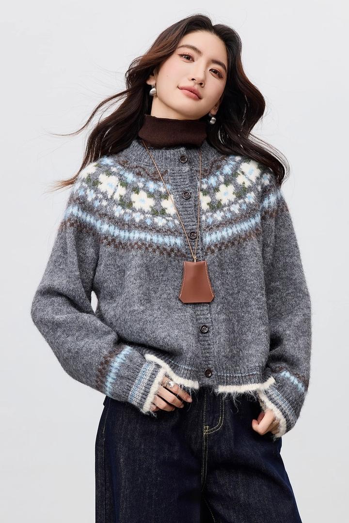 这款毛衣衣身局部由提花工艺钩织而成,排列着茉莉花与几何图案,营造出费尔岛复古气息。