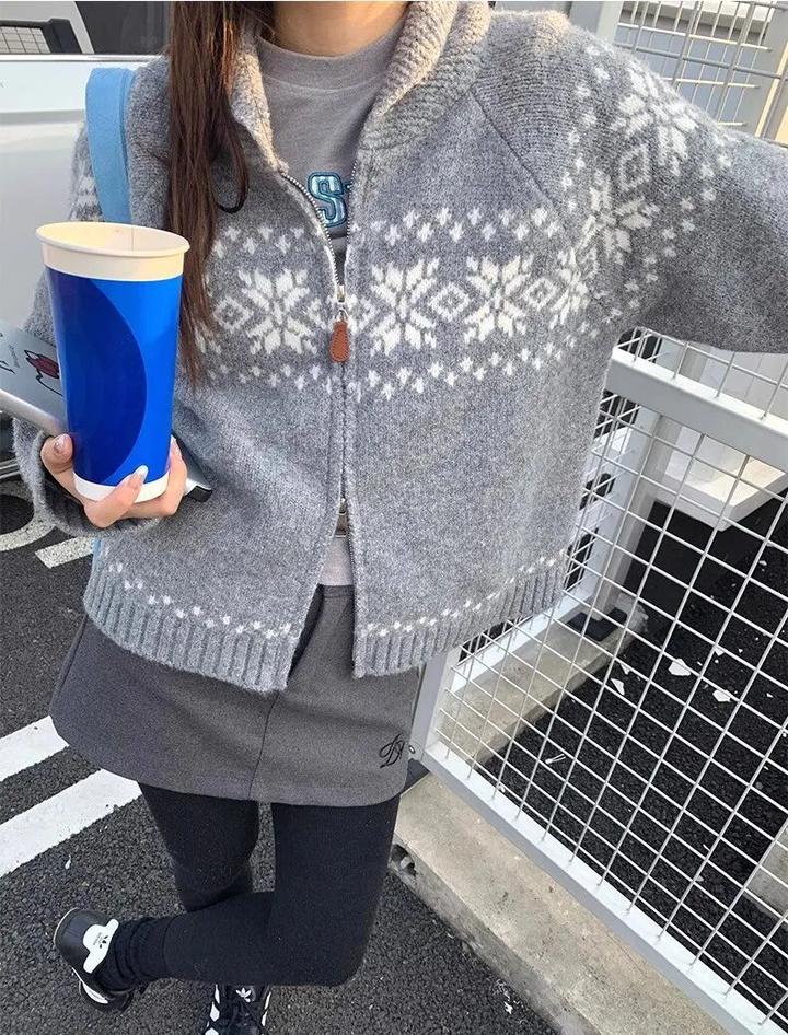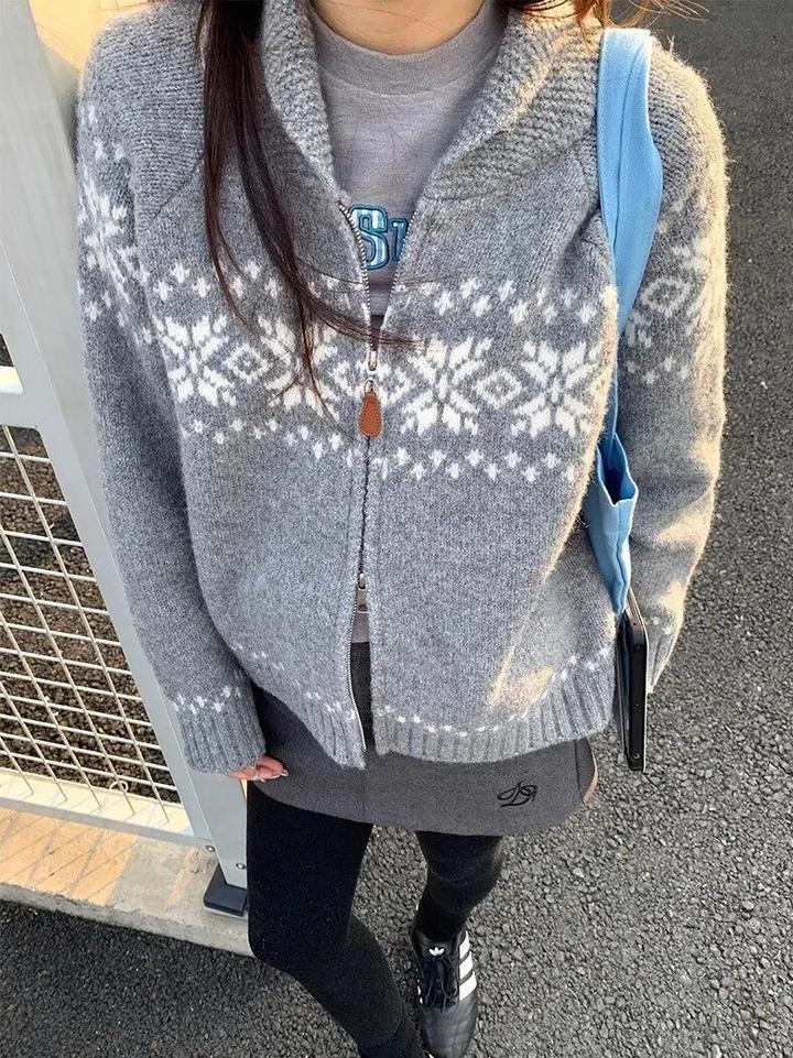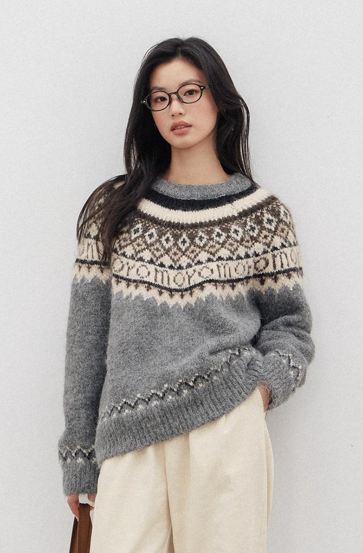 这件毛衣把经典的费尔岛花纹与灰、白、黑线条巧妙融合,演绎出复古优雅的苏格兰风情。