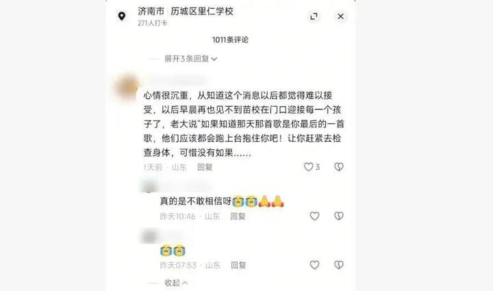 他的儿子在讣告中提到,父亲“一心投身工作,忽略了身体”,家长们惋惜“以后早晨再也见不到他,在校门口迎接每个孩子”。