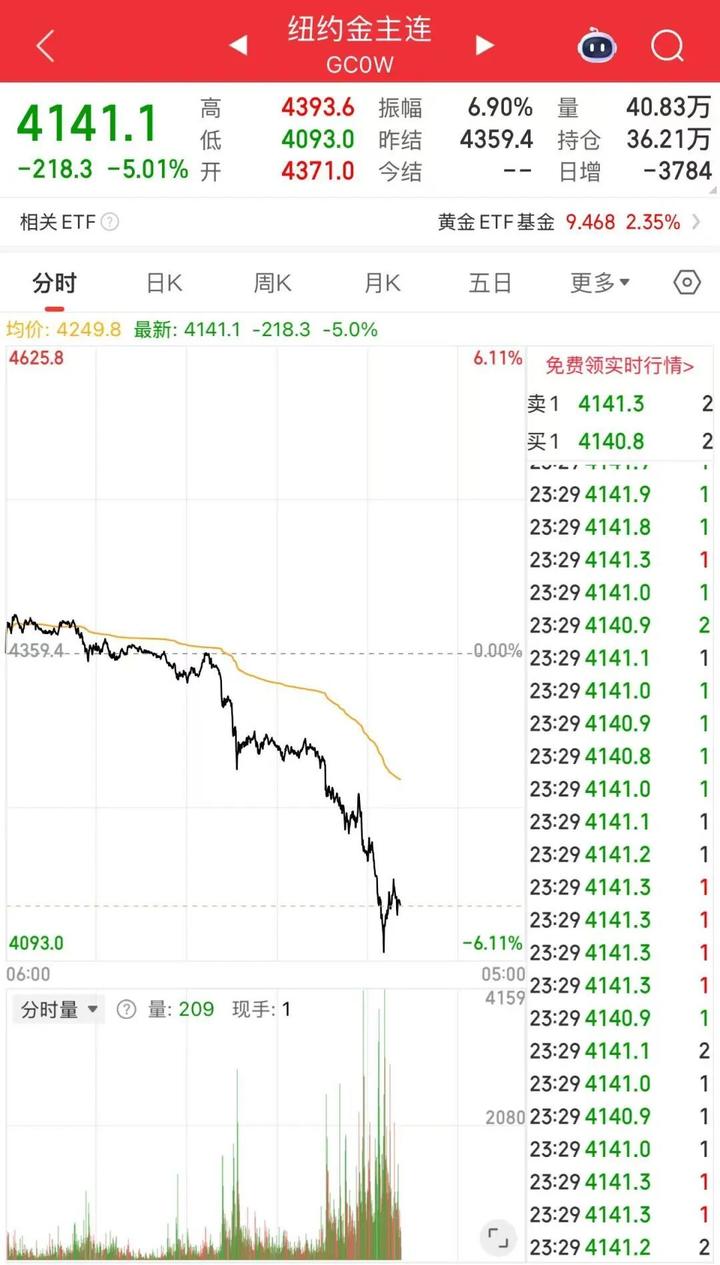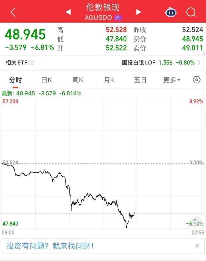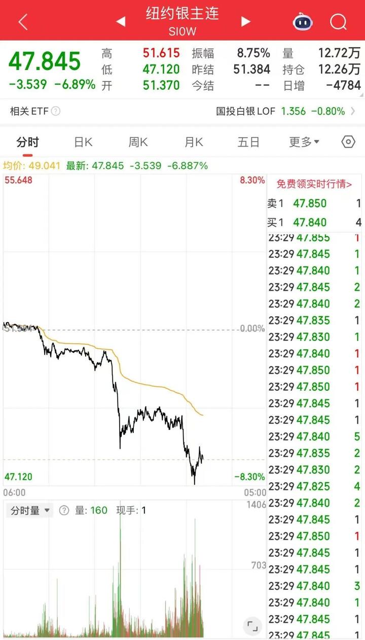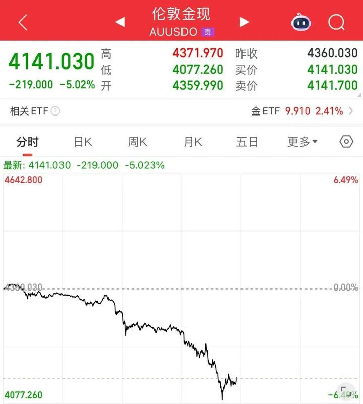 期货市场同样下挫。截至发稿,COMEX黄金跌5.01%,报4141.1美元/盎司;COMEX白银跌近7%,现报47.845美元/盎司。