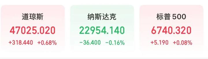 此外,美股三大指数开盘涨跌不一,截至发稿,道指涨0.68%,报47025.02点;纳指跌0.16%,报22954.14点;标普500指数涨0.08%,报6740.32点。