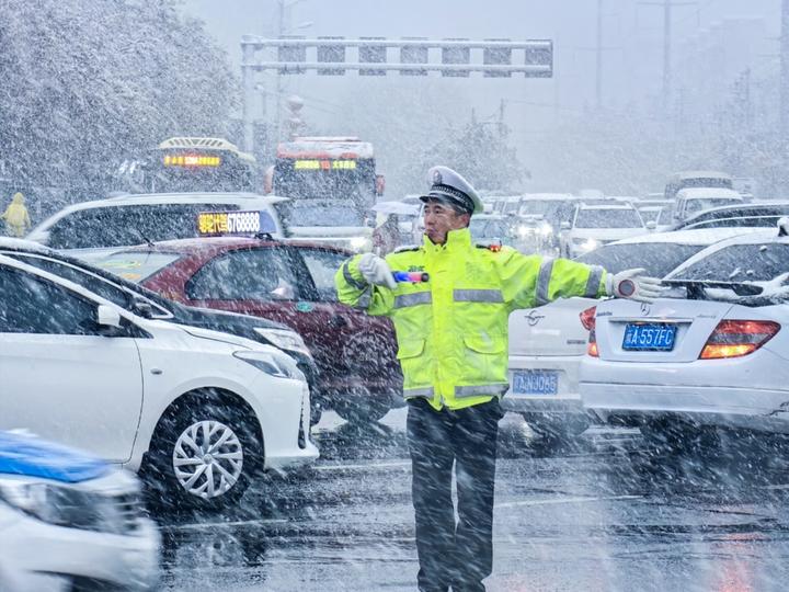 近日,新疆维吾尔自治区乌鲁木齐市出现降雪天气,交警冒雪疏导交通。李光崎 摄