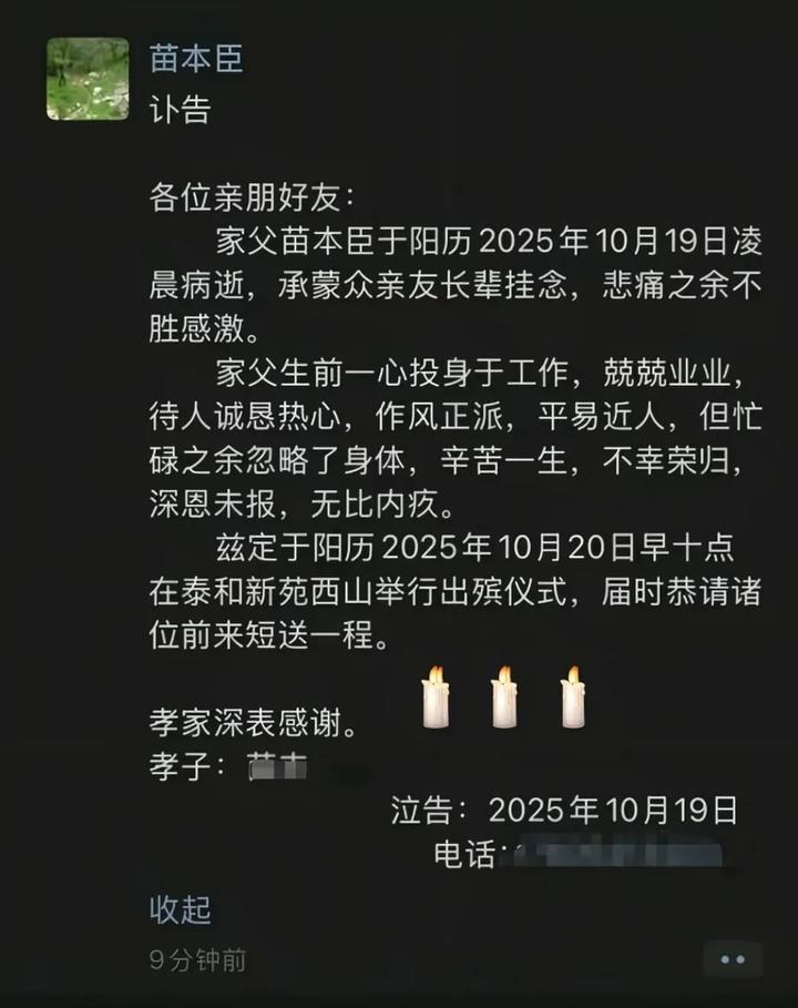 10月19日,因“被学生抢鸡排梗”走红网络的济南市里仁学校校长苗本臣病逝,年仅54岁。校方工作人员称20日已举办出殡仪式。