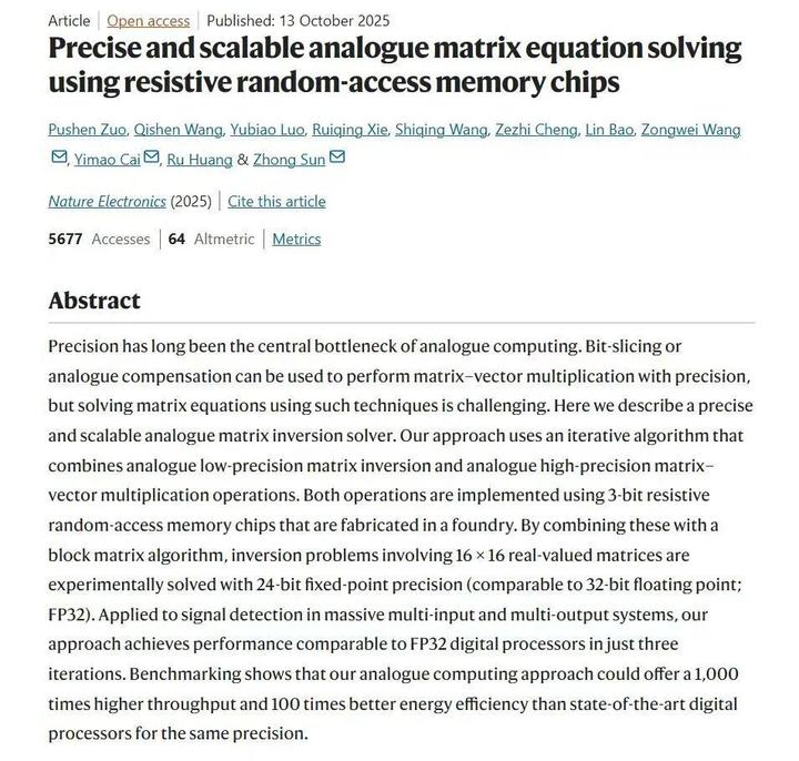 在计算精度方面,团队在实验上成功实现16×16矩阵的24比特定点数精度求逆,矩阵方程求解经过10次迭代后,相对误差可低至10⁻⁷量级。在计算性能方面,在求解32×32矩阵求逆问题时,其算力已超越高端GPU的单核性能;当问题规模扩大至128×128时,计算吞吐量更达到顶级数字处理器的1000倍以上,传统GPU干一天的活,这款芯片一分钟就能搞定。