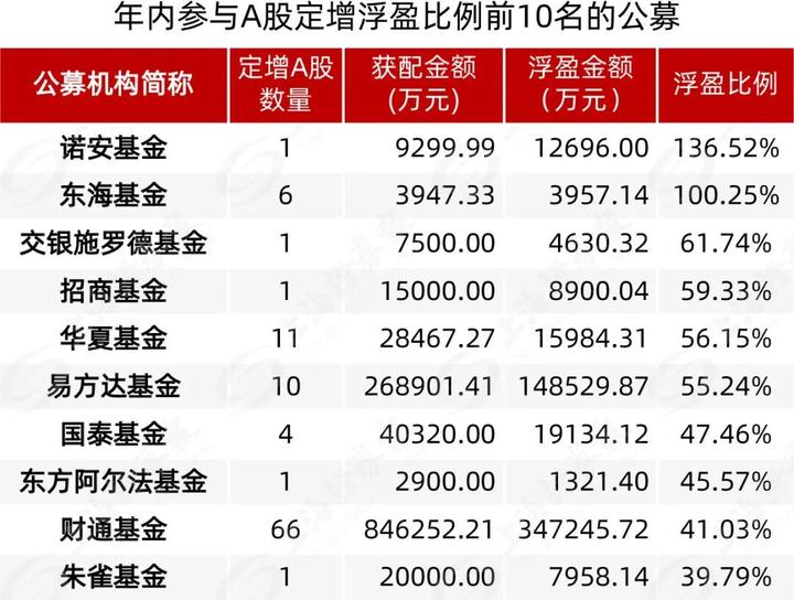 从浮盈比例来看,今年以来,除极少数情况外,参与定增的大多基金公司均处于浮盈状态,部分公司收获颇丰。