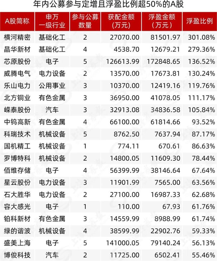 从浮盈比例来看,横河精密目前以301.08%的浮盈比例居首,排名第二的是晶华新材,浮盈比例达279.36%。此外,公募参与芯原股份、威腾电气、乐山电力、北方铜业和嵘泰股份等5只个股定增,目前浮盈比例均超100%。