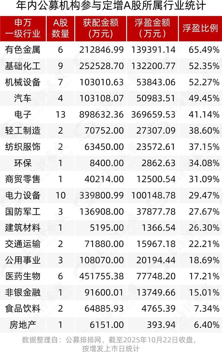 从公募参与定增的这些行业来看,平均浮盈比例均为正。部分行业目前的浮盈比例超过50%,包括有色金属、基础化工、机械设备。
