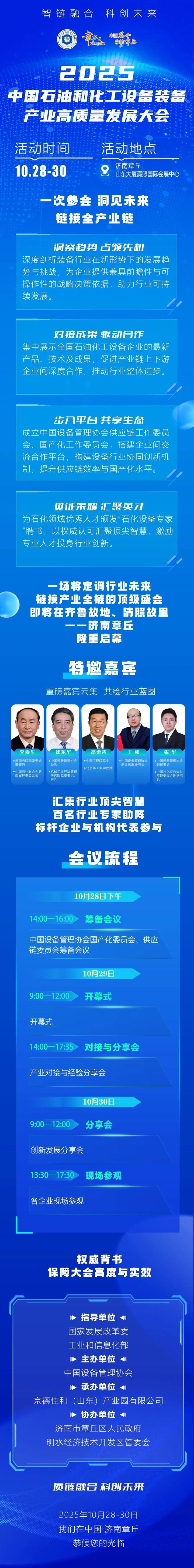 2025年10月28日至30日,一场备受瞩目的行业盛会——“2025中国石油和化工设备装备高质量发展大会” 将在齐鲁故地、清照故里——山东济南章丘隆重启幕。本次大会旨在深度聚焦产业未来发展趋势,构建全产业链协同发展桥梁,被业界视为一场“定调未来、链接全链”的顶级行业盛会。