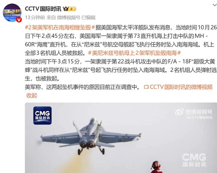 据美国海军太平洋舰队发布消息,当地时间10月26日下午2点45分左右,美国海军一架隶属于第73直升机海上打击中队的MH - 60R“海鹰”直升机,在从“尼米兹”号航空母舰起飞执行任务时坠入南海海域。机上全部3名机组人员被救起。