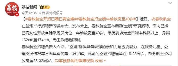 近日,@春秋航空在兰州举行招聘新闻发布会。发布会上,春秋航空宣布启动“空嫂”专项招聘,面向已婚已育女性开放客舱乘务员岗位,年龄放宽至40岁,学历要求为全日制本科及以上,身高162cm至174cm,无工作经验限制。
