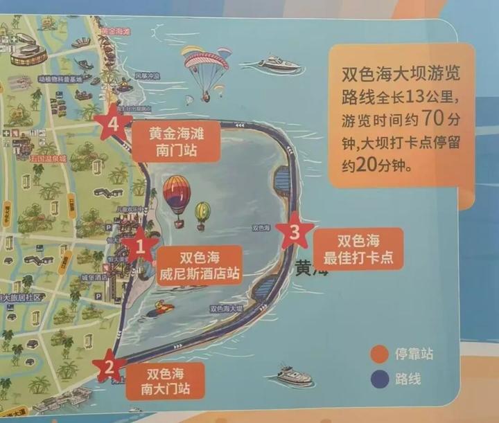 “双色海”是这个江苏沿海城市的一个旅游打卡点。根据景区介绍,大坝呈U形,将海水分成两种颜色,一边是蓝,一边是黄。整段游览路线全长约13公里,乘坐观光小火车需70分钟,在打卡点停留20分钟。