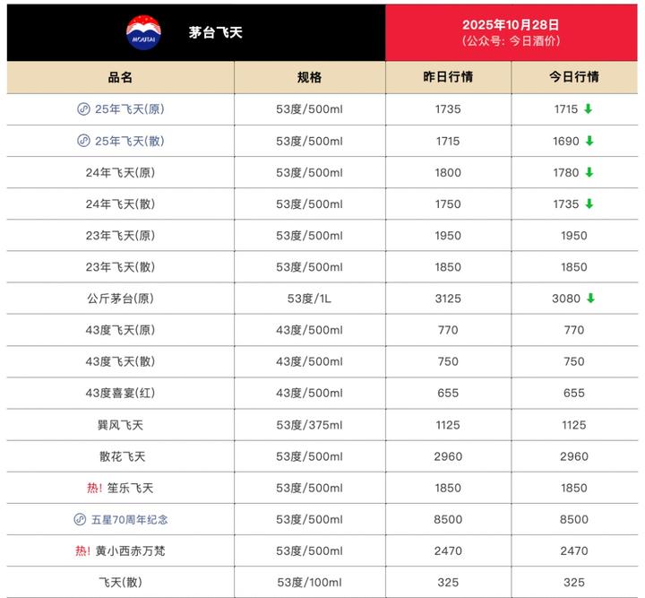 “今日酒价”披露的最新批发参考价显示,10月28日,25年飞天茅台原箱报1715元/瓶,较前一日下跌20元;25年飞天茅台散瓶报1690元/瓶,较前一日下跌25元,首次跌破1700元/瓶大关,再创上市以来新低。