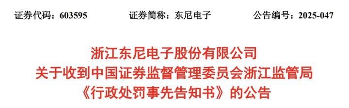 浙江证监局对公司的违规信披和财务造假数罪并罚。其决定,对东尼电子给予警告,并处以700万元罚款。同时,对时任董事长沈新芳、时任总经理沈晓宇、时任财务总监杨云和钟伟琴、时任董事会秘书翁鑫怡、时任副总经理罗斌斌给予警告,并分别罚款350万元、170万元、100万元、100万元、90万元和60万元。