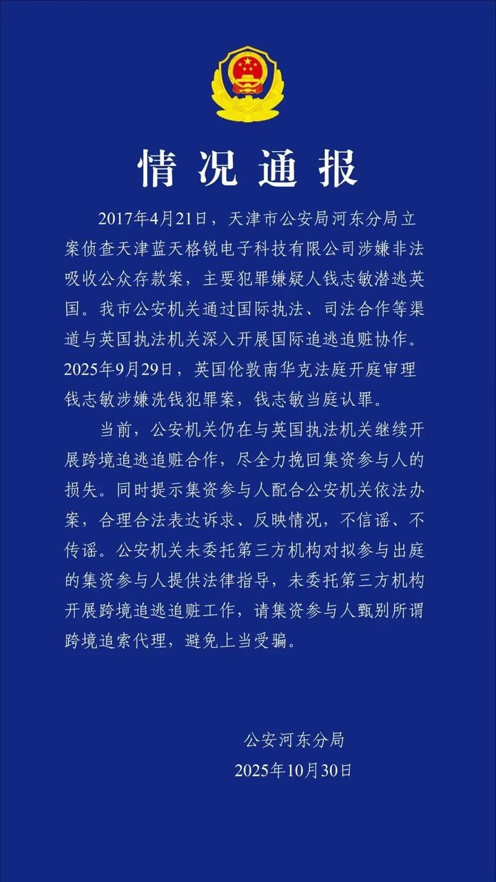 2017年4月21日,天津市公安局河东分局立案侦查天津蓝天格锐电子科技有限公司涉嫌非法吸收公众存款案,主要犯罪嫌疑人钱志敏潜逃英国。天津市公安机关通过国际执法、司法合作等渠道与英国执法机关深入开展国际追逃追赃协作。