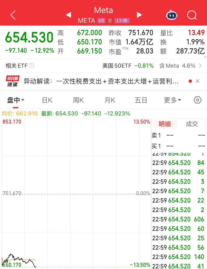 美股科技股多数下跌,截至发稿,微软跌超3%,亚马逊跌超1%。Meta股价开盘暴跌,截至发稿跌近13%,报654.53美元/股,总市值为1.64万亿美元(截至10月29日美股收盘,Meta总市值为1.89万亿美元)。
