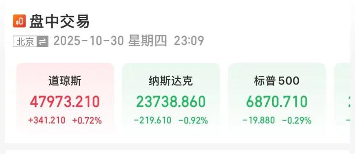 当地时间10月30日,美股集体低开,截至发稿,三大指数涨跌互现,道指涨0.72%,报47973.21点;标普500指数跌0.29%,报6870.71点;纳指跌0.92%,报23738.86点。