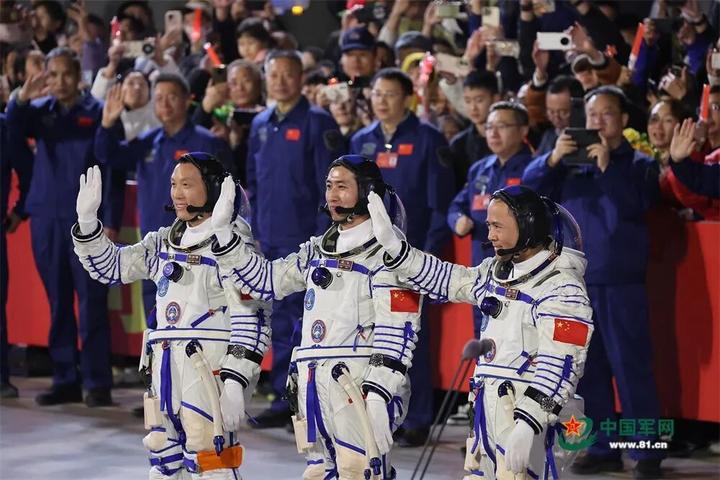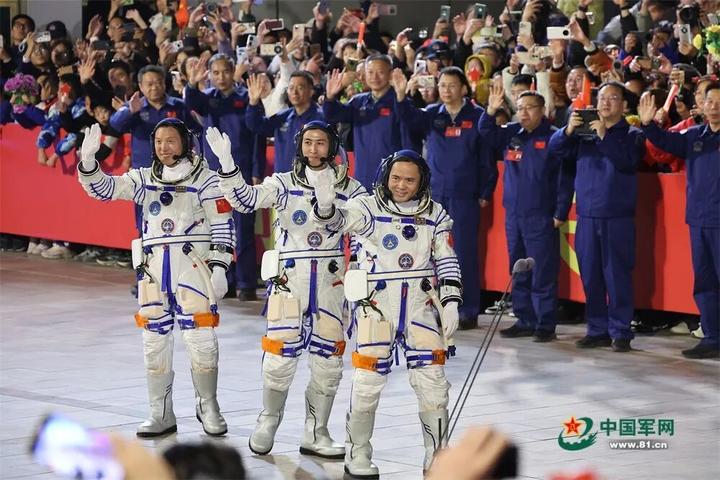 这一刻,飘扬的国旗、乳白色的航天服与无数期盼的目光交汇,三位航天员怀着共同的飞天梦想与崇高使命,步履坚定。